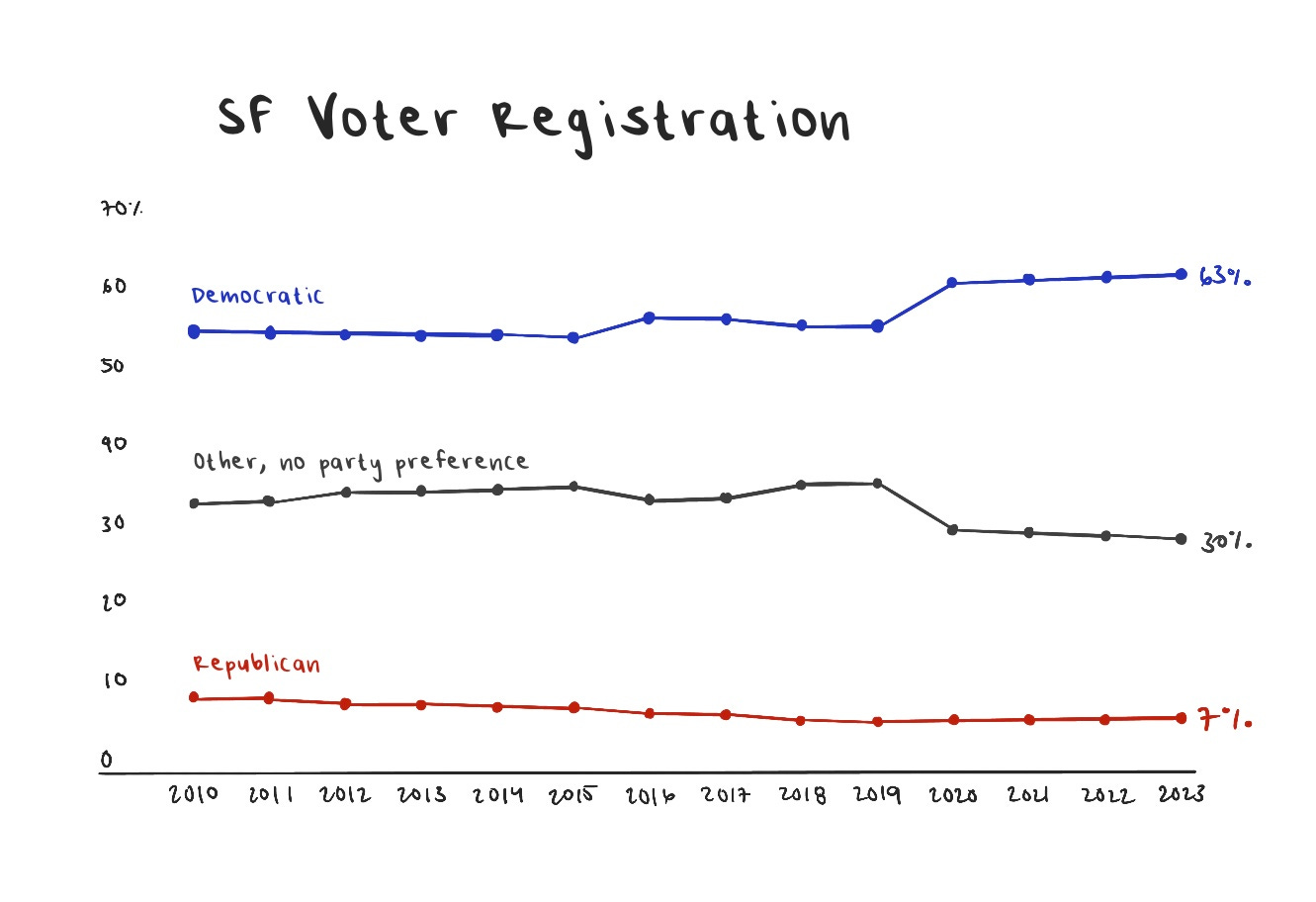 That said, we also need to be realistic about SF’s politics. 63% of registered voters in San Francisco will be choosing between Democratic candidates for the DCCC, which means that there’s likely a greater need for information for that party. So, we focused this post on the DCCC. However, we do touch on the equivalent committee for the Republican Party (RCCC) later in this post. No other parties (Independent, Green, Peace and Freedom) will have races for their committees.